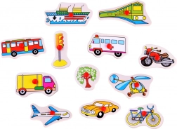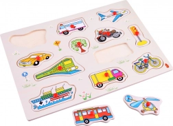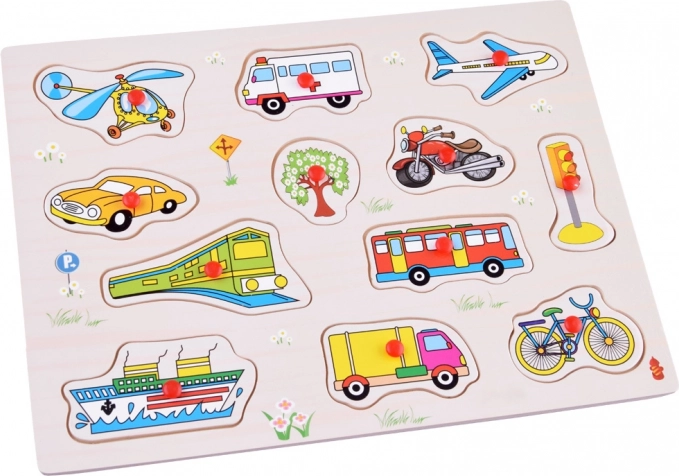 De houten puzzel met vervoermiddelen brengt plezier en leren samen. Met deze puzzel leren kinderen verschillende vormen van vervoer herkennen en verbeteren zij tegelijkertijd hun motorische vaardigheden. Elk van de 12 stukjes is gemakkelijk vast te pakken dankzij het kleine rode knopje.
