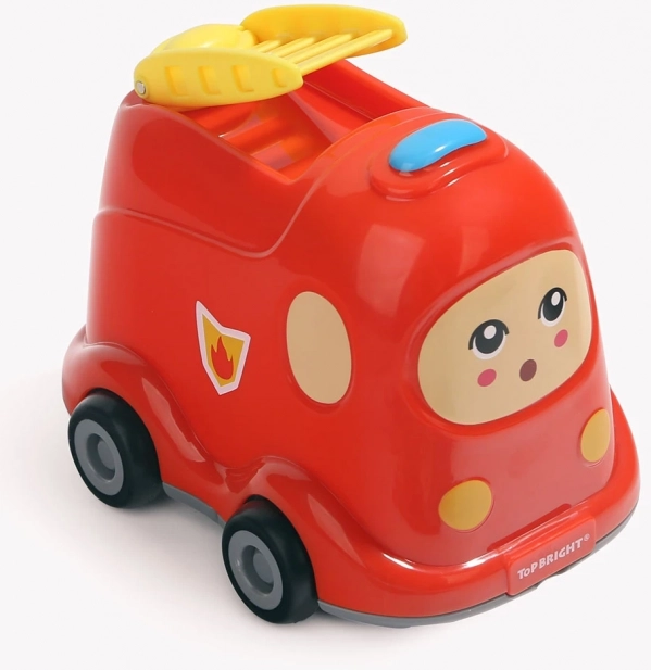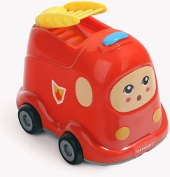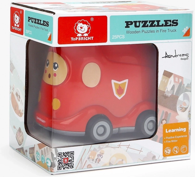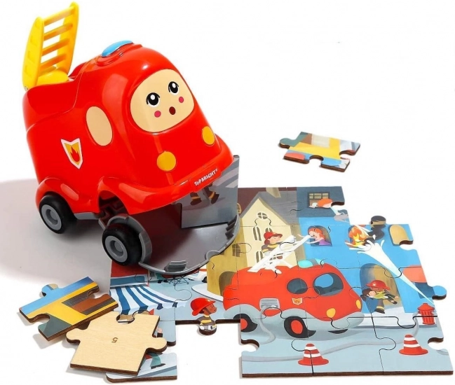 Praktische combinatie van een houten puzzel en een plastic brandweerauto met wieltjes. Spelen en opbergen op één plek dankzij het slimme opbergdeksel.