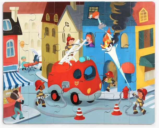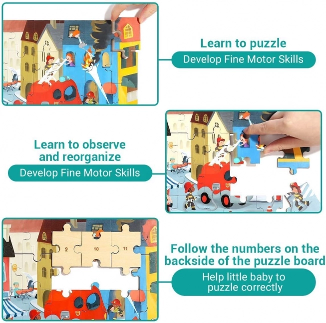 Ontdek een leuke en educatieve speelset die een houten puzzel met het thema brandweerauto combineert met een hoogwaardig plastic autootje met rollende wieltjes. Elk puzzelstukje is aan de achterkant genummerd, zodat kinderen makkelijker vooruitkomen en spelenderwijs cijfers, logica en geduld oefenen.