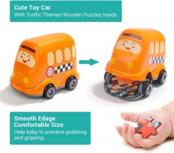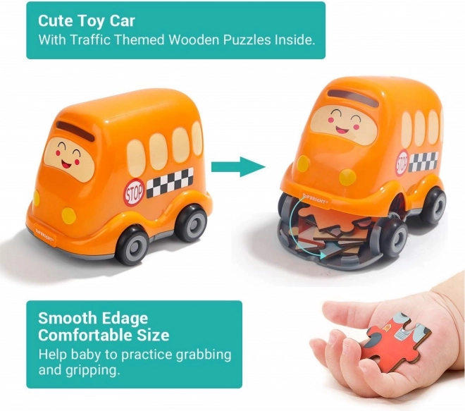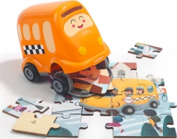 Leuke en leerzame houten puzzel met het thema van een schoolbus, opgeborgen in een schattig kunststof speeltje op wieltjes. De puzzel heeft 24 stukjes met nummers op de achterkant voor makkelijker leggen, en stimuleert logisch denken en fijne motoriek. De kunststof bus heeft een openend deksel om de stukjes in op te bergen en maakt deel uit van een mini-serie vervoermiddelen met de mogelijkheid om een panoramische puzzel te maken.