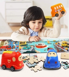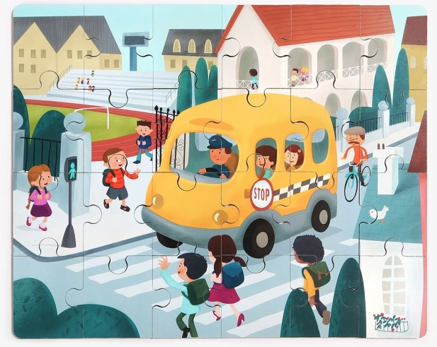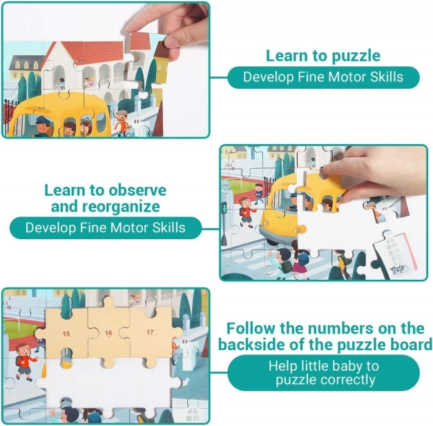 Ontdek het slimme 2-in-1 speelgoed: een hoogwaardige houten puzzel met het thema verkeer en een kunststof schoolbus met opbergruimte. De genummerde achterzijden van de stukjes helpen kinderen stap voor stap de afbeelding te leggen, terwijl ze hun logica, verbanden en motorische vaardigheden trainen.