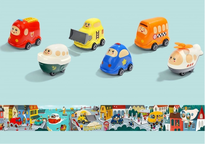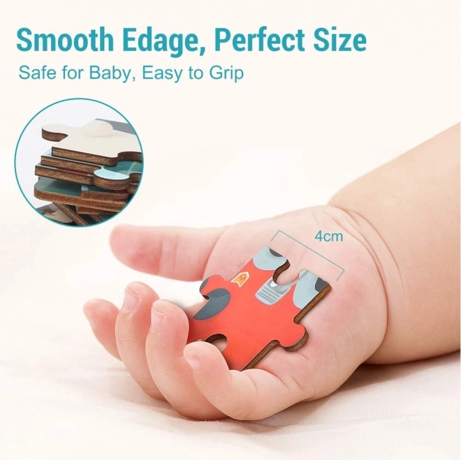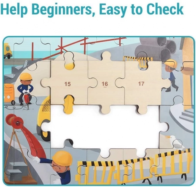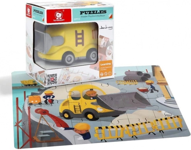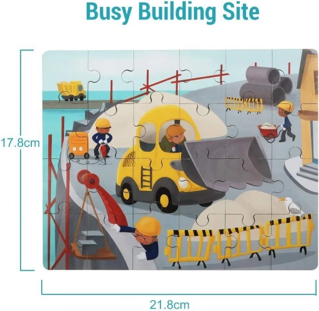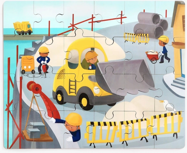 Ontdek een slimme speelgoedset die speelplezier met leren combineert. De houten puzzel met een voertuigenthema (bouwplaats) is verstopt in de kunststof bulldozer. Deze heeft een veilige, gladde afwerking, wieltjes om te rijden en een openende onderklep waarin kinderen de puzzel of hun schatten gemakkelijk kunnen opbergen.