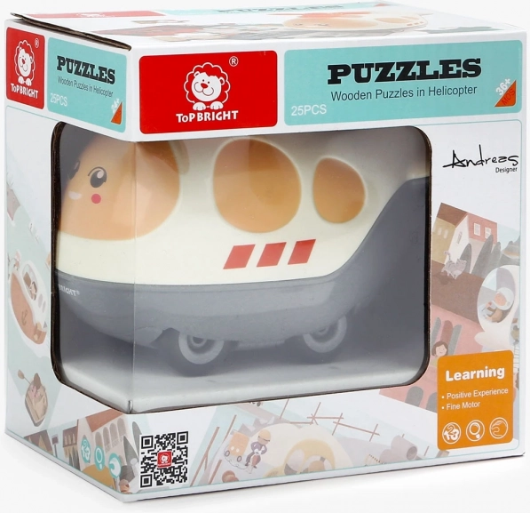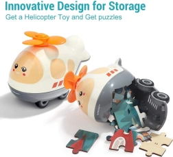 Ontdek het slimme 2-in-1 speelgoed: een houten puzzel met vervoersthema en een kunststof helikopter met een klep om puzzelstukjes en andere schatten in op te bergen. De puzzelstukjes zijn genummerd, zodat kinderen makkelijk hun weg vinden en het leggen leuker én leerzamer is.