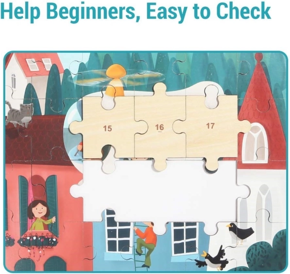Elk houten puzzelstukje heeft aan de achterkant een nummer. Kinderen oefenen logica, tellen en geduld zonder onnodige frustratie.