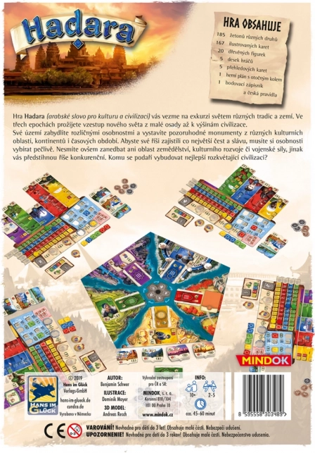 Hadara van MINDOK: strategisch bordspel over het opbouwen van een beschaving in 3 tijdperken. Balanceer economie, cultuur en leger. 2–5 spelers, 45–60 min, CZ.
