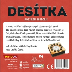 Breid je favoriete kennisquiz uit met een thematisch pakket over geschiedenis. Deze uitbreiding bevat 50 dubbelzijdige kaarten, 100 nieuwe categorieën en 1000 vragen en antwoorden over heersers, veldslagen, ontdekkingen en andere historische wetenswaardigheden. De kaarten zijn vrij te combineren met andere uitbreidingen en kunnen de helft van de kaarten uit het basisspel vervangen. Niet speelbaar zonder het basisspel Desítka of Desítka Česko.
