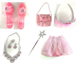 Deze betoverende roze set voor kleine prinsessen verandert elke middag in een sprookjesachtig avontuur. Kinderen zullen houden van de combinatie van het lichte rokje, de schattige muiltjes en het handtasje dat de hele koninklijke outfit compleet maakt. Geweldig voor verkleden, thuis toneelspelen, carnaval en verjaardagsfeestjes.