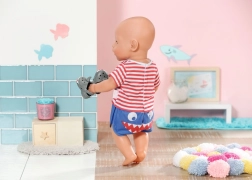 Gun je pop een stijlvolle bedtijd met het BABY born-pyjama met oceaanthema. Het rood‑witte gestreepte T‑shirt met haai en de blauwe onderstukken met een lachende haai toveren een glimlach op het gezicht van elke kleine verzorger. Grijze schoentjes in haaienvorm maken de outfit compleet en ondersteunen fantasierijk spel.