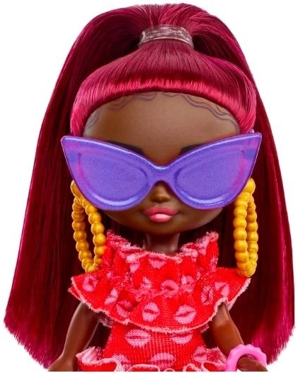 Deze mini BARBIE-pop uit de Extra Mini Minis-collectie betovert met een stralende outfit met rode ruches, lang rood haar en opvallende accessoires zoals paarse zonnebril, gele creolen en een roze handtas. Dankzij het compacte formaat is ze perfect voor op reis en in de kinderkamer.