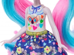 De pop is uitgerust met lang blauw haar met roze strepen en kleurrijke kleding, die de aandacht van elk kind trekt.