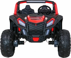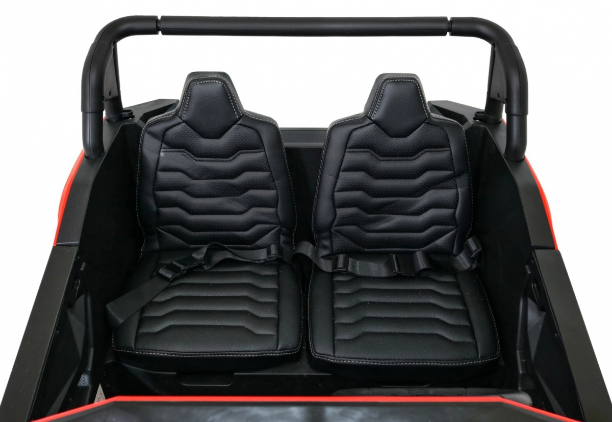 Robuuste kinderbuggy voor twee kinderen met 4x200 W vermogen, een 24V 7Ah accu en 4x4-aandrijving, geschikt voor terrein en tuin. Biedt soepele start, LED-verlichting voor en achter, audiopaneel met MP3/USB/AUX/Bluetooth en veilig rijden dankzij de veiligheidsgordel en 2,4 GHz afstandsbediening met Stop-functie.