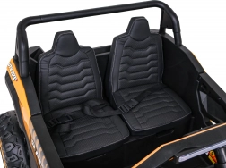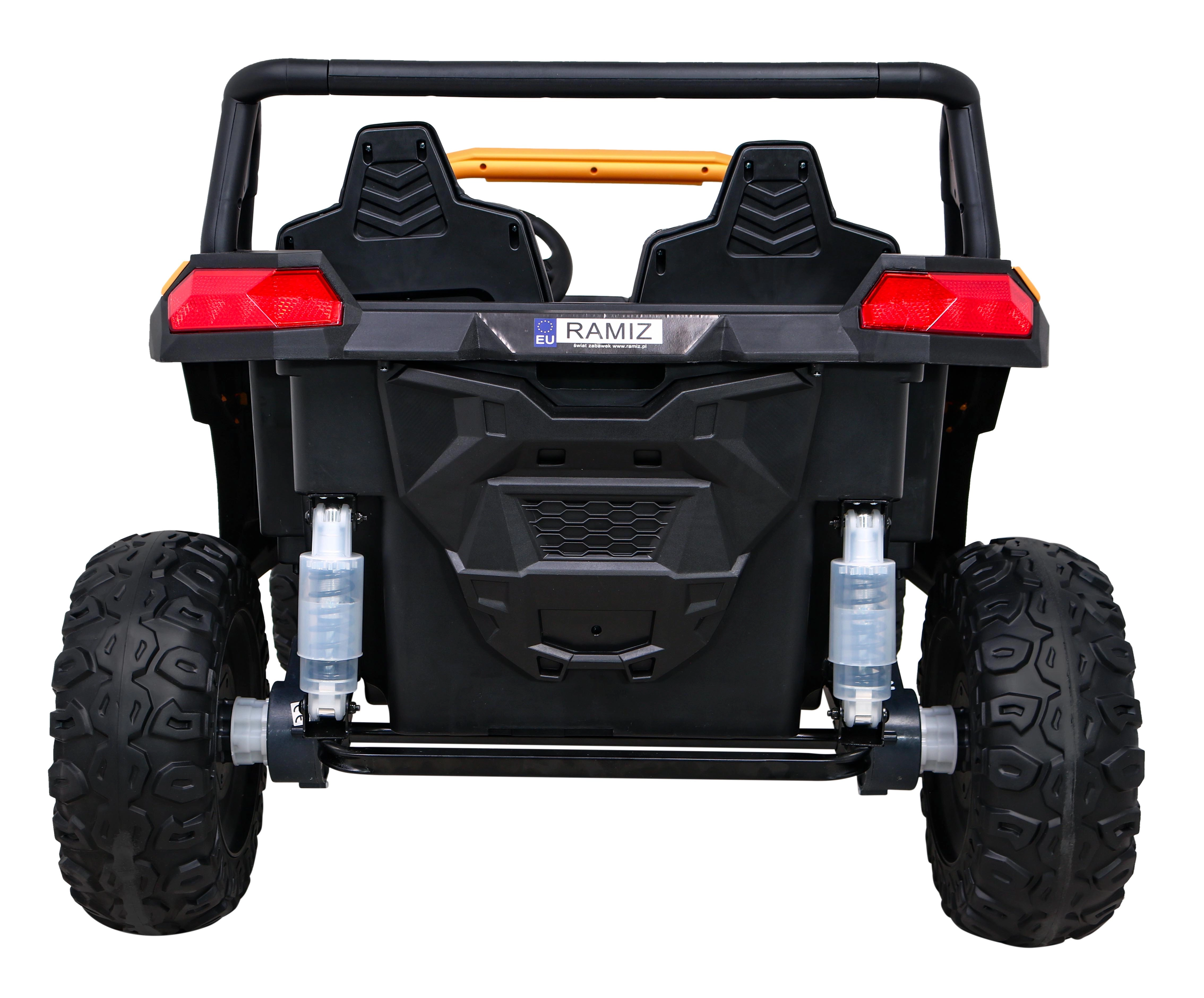 Krachtige kinderbuggy voor twee kinderen met 4x4-aandrijving, 24V 7Ah-accu en vier motoren van 4×200 W. Biedt vloeiende start, twee snelheden, 2,4 GHz afstandsbediening met noodstop, EVA-schuimbanden voor comfortabel rijden en LED-verlichting voor en achter. Interactief audiopaneel met MP3/USB/AUX/Bluetooth, openslaande deuren, geventileerde zitting van eco-leer met veiligheidsgordels en 3-traps verschuiving voor maximaal comfort.