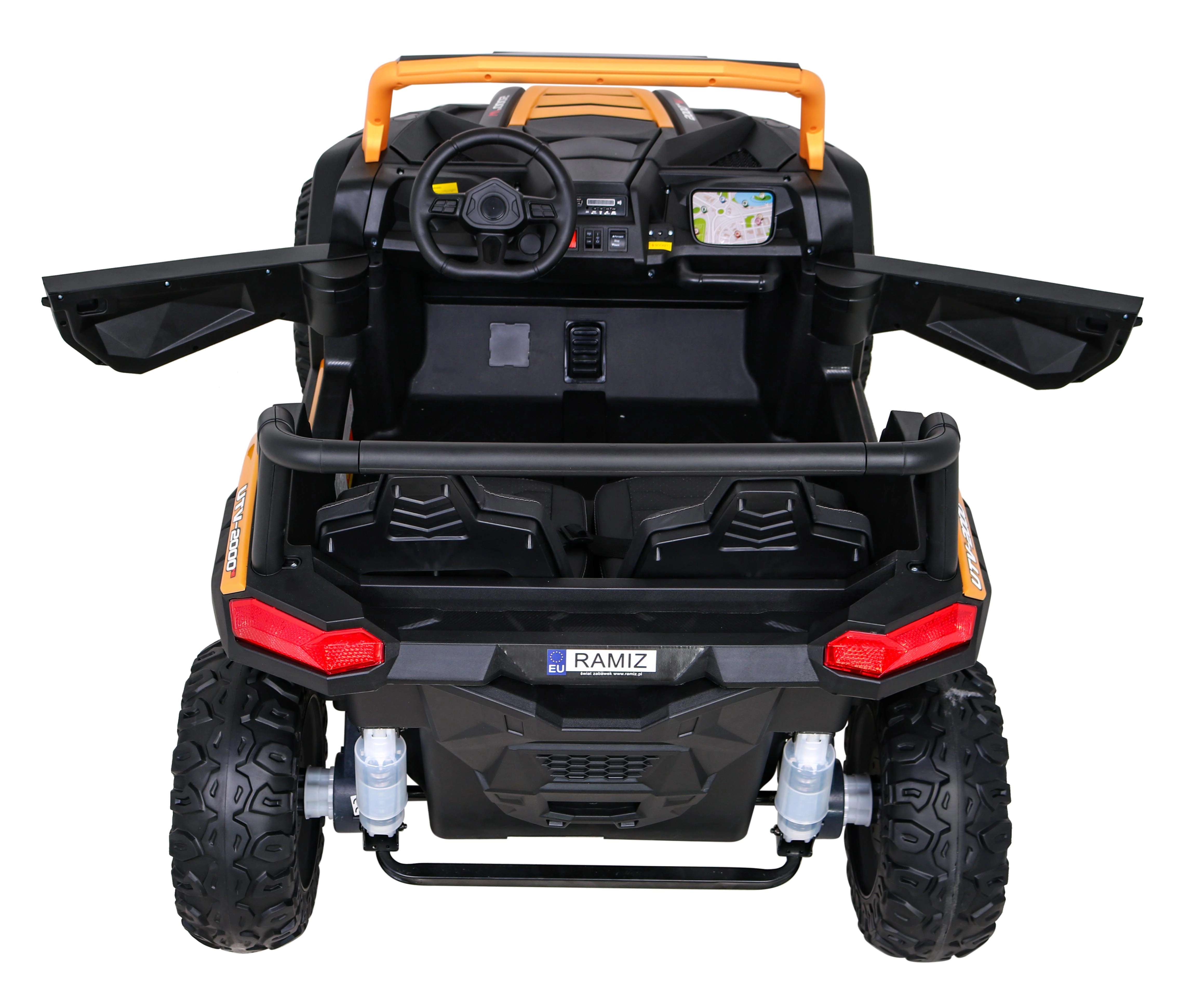 Veiligheid en controle zijn gewaarborgd dankzij de 2,4 GHz afstandsbediening met noodstop, veiligheidsgordels en openslaande deuren. Kinderen zullen genieten van de realistische motorgeluiden bij het starten, LED-verlichting en uitgebreide multimedia: MP3, USB, AUX, Bluetooth en geluiden in het stuur.