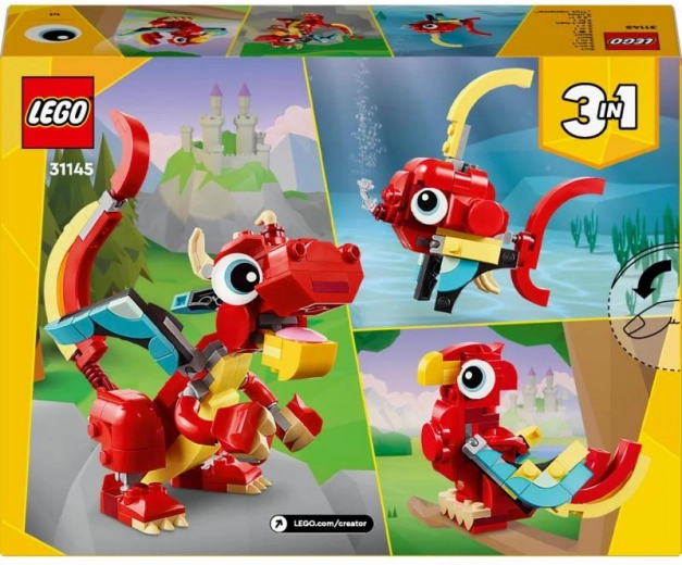Ontdek de magie van de LEGO Creator 3-in-1 Rode Draak, die kinderen vanaf 6 jaar eindeloos creatieve speelpret biedt. Van dezelfde stenen bouw je een bewegende draak, een prachtige feniks met kleurige veren of een elegante vis met beweegbare vinnen. Elk model is geschikt om neer te zetten en poseert perfect dankzij de rijke scharnierende beweeglijkheid.