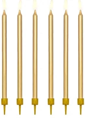 Elegante, gladde verjaardagskaarsen in metallic goud geven je taart een feestelijke uitstraling. De verpakking bevat 12 kaarsen van 12,5 cm en 12 houders voor eenvoudig plaatsen.
