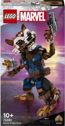 Het authentieke Rocket-figuur vangt zijn rebelse blik en liefde voor wapens – in zijn handen houdt hij een veerwerper en een blaster. Dankzij de gewrichten in alle belangrijke delen (behalve de ellebogen) kun je hem gemakkelijk in dynamische poses zetten en zijn trouwe maatje Baby Groot toevoegen, die op de schouder kan worden bevestigd.
