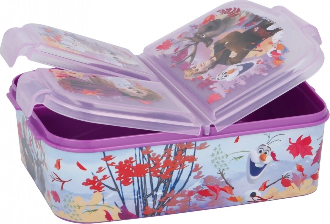 De kinder-snack-multibox met officiële FROZEN II-licentie combineert een mooi design met een doordachte indeling. Drie aparte secties maken het mogelijk fruit en groenten, een sandwich en kleine snacks te scheiden, zodat de snack de hele dag vers en overzichtelijk blijft.