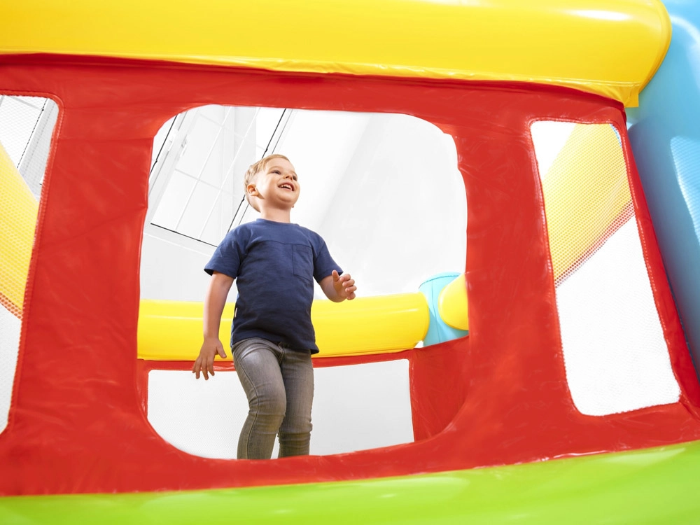 Het duurzame PVC-materiaal is ontworpen voor frequent gebruik en eenvoudige reiniging. De ingang maakt comfortabel in‑ en uitstappen mogelijk en haringen voor verankering houden de attractie op zijn plaats, ook bij uitbundiger buitenspel.