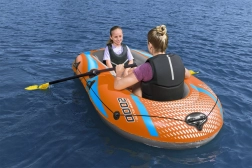 De opblaasbare vloer biedt extra zitcomfort, terwijl de volledig opgeblazen structuur stabiliteit en veilige vaart op rustige wateren verzekert.