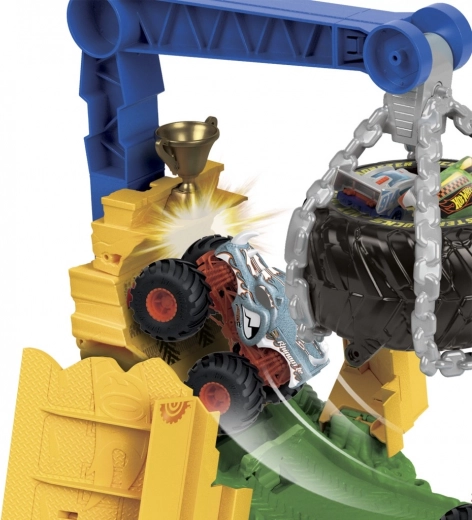 HOT WHEELS Monster Trucks Rhinomite Arena Smashers: actierijke set met zwaaiende band, 1:64-truck en 2 crush-autootjes. Koppelbare arena, plezier vanaf 4 jaar.