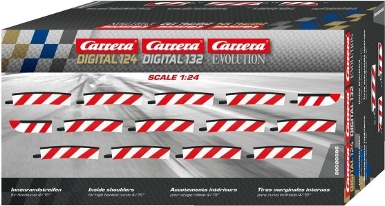 Praktische set binnenbermen voor de verkante bocht 4/15° verbetert de stabiliteit en souplesse op CARRERA EVOLUTION, DIGITAL 132 en DIGITAL 124 racebanen. In de verpakking zitten 12 stuks bermen met radius R4, die de rijstrook aan de binnenzijde van de bocht verbreden en zo grip en veiligheid in snelle secties verhogen.