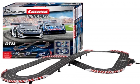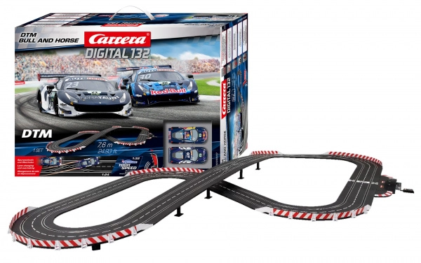 Beleef een professionele racesfeer met de CARRERA DIGITAL 132 racebaan in de set DTM Bull and Horse. Dankzij de baanlengte van 7,6 m, twee gedetailleerd uitgevoerde FERRARI 488 GT3-wagens en draadloze controllers geniet je van intense races met tot 6 bestuurders op één baan. Het systeem biedt inhalen op rechte stukken en in bochten, een realistische tank-simulatie, koppeling met smartphone/tablet en lichteffecten bij de meeste auto’s.