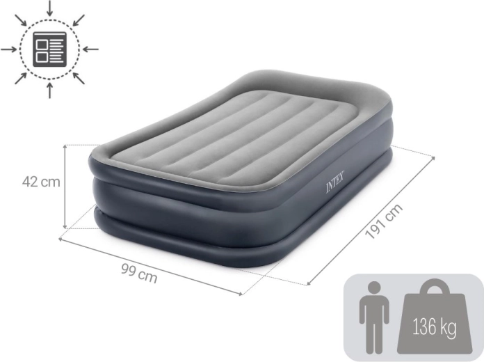 INTEX opblaasbaar eenpersoonsbed biedt afmetingen van 191 × 99 × 42 cm, een ingebouwde elektrische pomp voor snel opblazen, een fluweelzachte velours toplaag voor comfort en een duurzame Fiber‑Tech / Dura‑Beam constructie voor stabiele ondersteuning. Maximale draagkracht 136 kg, inclusief draagtas en reparatiepatch.