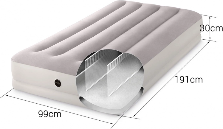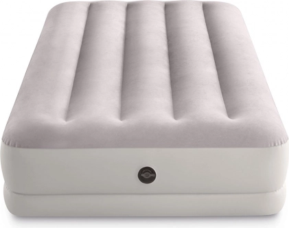 Praktisch opblaasbaar matras van INTEX met afmetingen 191 × 99 × 30 cm voor een comfortabele nachtrust van één persoon, thuis en onderweg. Dankzij de Dura-Beam Fiber-technologie is het stabiel en biedt het goede lichaamsondersteuning. Het aangename suède (flock) oppervlak is zacht aan de touch en antislip. Inclusief een compacte USB elektrische pomp voor snel opblazen en leeg laten lopen en een transportzak voor eenvoudig dragen.