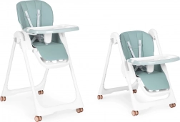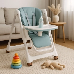 De dubbele tray met verhoogde randen en bekerhouder vermindert knoeien en de bovenste laag haal je na de maaltijd eenvoudig af om te reinigen. De bekleding van eco-leer veeg je schoon met een vochtige doek. Wielen met rubber loopvlak maken verplaatsen eenvoudig zonder de vloer te krassen en geïntegreerde wielvergrendelingen fixeren de stoel betrouwbaar.