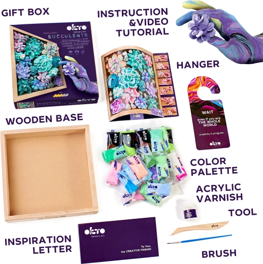 Creatieve set voor liefhebbers van knutselen en beginners. Maak realistische vetplanten van zelfhardende klei en stel ze tentoon in een elegant houten frame van 21 × 21 cm. De set bevat alles wat je nodig hebt – klei, vormgereedschap, penseel en geïllustreerde handleiding – gewoon openen en beginnen met creëren.