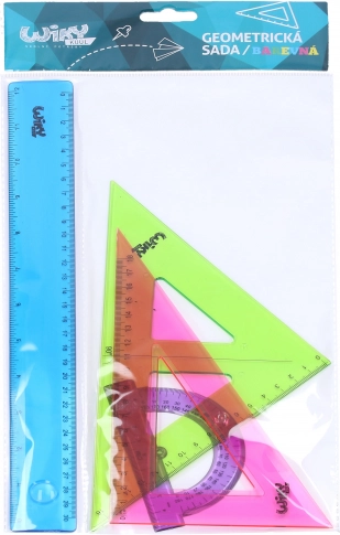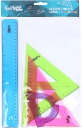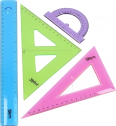 Praktische schoolgeometrieset voor dagelijks tekenen en lesgebruik. Bevat een rechte liniaal van 30 cm, een kleine gradenboog en twee driehoeken in een overzichtelijke, kleurrijke uitvoering voor eenvoudige oriëntatie.