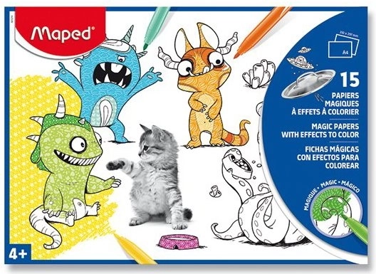 Ontdek het plezier met de roze magische kleurplaten van MAPED in A4-formaat. Tijdens het inkleuren verschijnen met behulp van een speciale stift verborgen patronen op de afbeeldingen, die je creaties een uniek effect geven. Bevat 15 verschillende afbeeldingen op hoogwaardig papier van 120 g/m², ideaal voor kinderen vanaf 4 jaar.