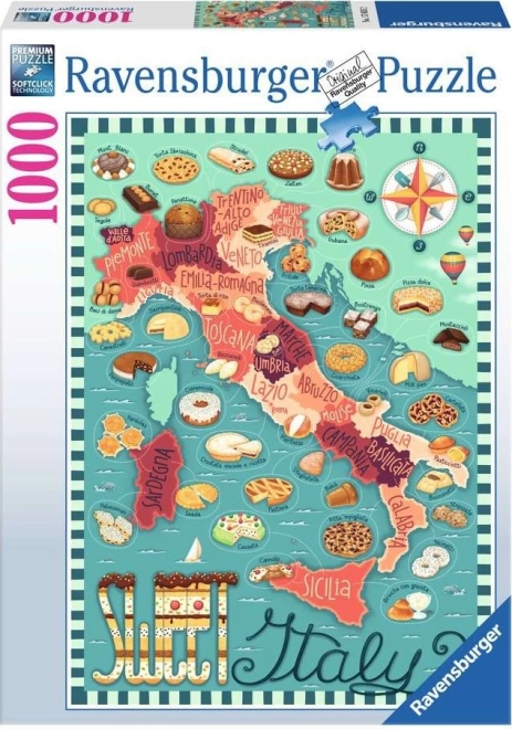 Ontdek de charme van Italië in een zoete uitvoering met de hoogwaardige puzzel van RAVENSBURGER. Deze gedetailleerd geïllustreerde puzzel met het motief “Zoete kaart van Italië” biedt 1000 stukjes, nauwkeurige uitsnijdingen en een mat oppervlak voor comfortabel puzzelen. Ideaal voor liefhebbers van reizen, gastronomie en ontspanning met legpuzzels.