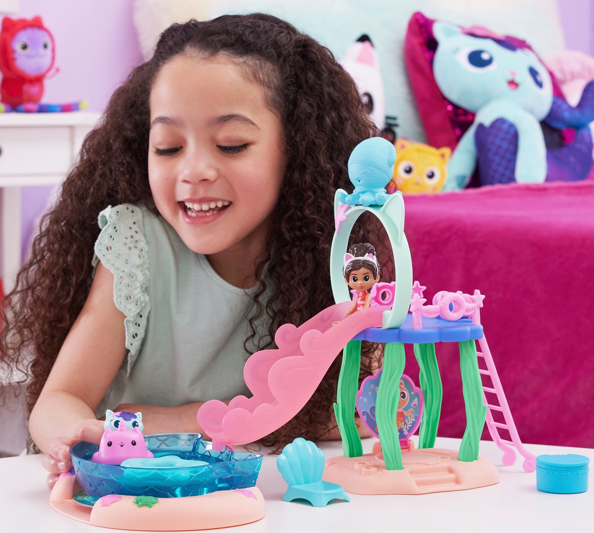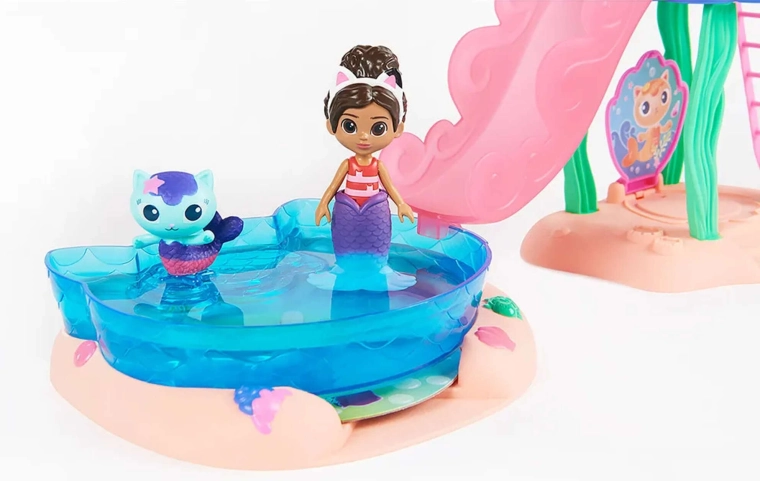 - Gabby-figuur met afneembare zeestaart, Zeemeow-figuur, glijbaan, zwembad, ladder, schelp met afbeelding, “inktvis”-verstuiver, drijvers, Kattenpost met minifiguur en QR-code