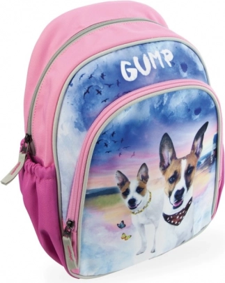De rugzak is voorzien van een kleurrijk frontpaneel met illustraties van honden en de tekst 'GUMP', wat hem tot een aantrekkelijke accessoire maakt.