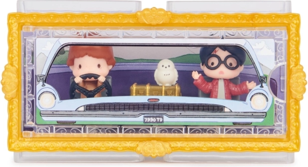 Betreed de Wereld van de Geheime Kamer met gedetailleerde mini-figuren van 3,81 cm. Harry en Ron in de iconische vliegende auto van de familie Weasley en de uil Hedwig zullen elke fan blij maken. Het transparante doosje met thematische achtergrond creëert het effect alsof de personages rechtstreeks in de auto zitten – perfect voor een stijlvolle presentatie.