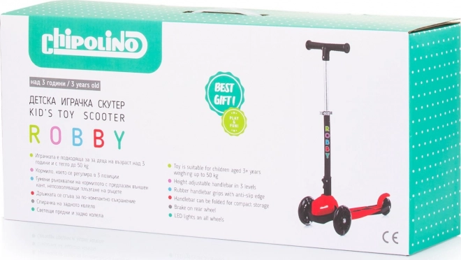 Ontdek de stabiele kinderstep Chipolino Robby met kleurrijke LED-lichten, geschikt voor kinderen vanaf 3 jaar en kan tot 50 kg dragen. Geniet van een veilige rit dankzij de lichte aluminium constructie en in hoogte verstelbare stuur.