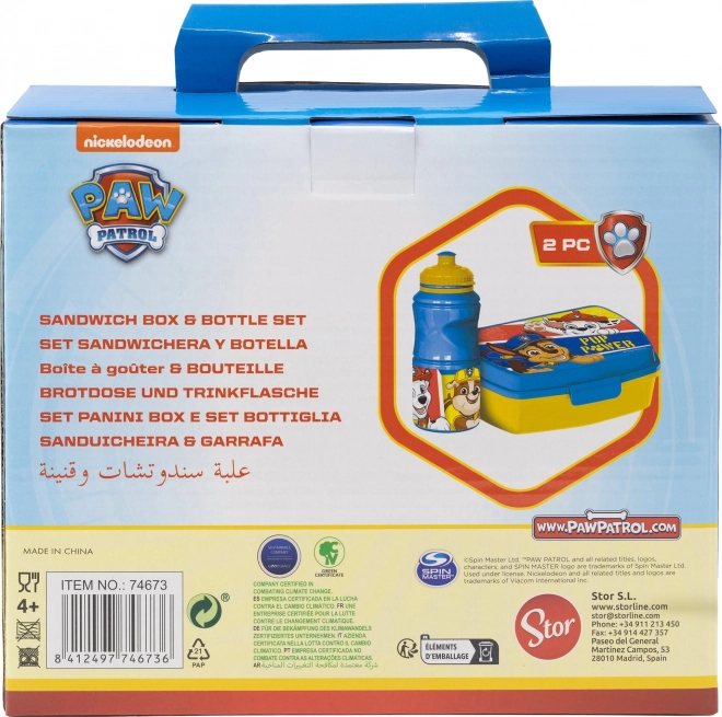 Praktische kinderset voor school en uitstapjes: een duurzame lunchbox en een kunststof drinkfles van 380 ml met licentie PAW Patrol. De box is gemaakt van duurzaam materiaal met decor op het deksel; de fles heeft een ergonomische vorm, een lekvrije veiligheidsdop en een antislipgreep. Het materiaal is BPA- en ftalaatvrij en alles is eenvoudig te reinigen.