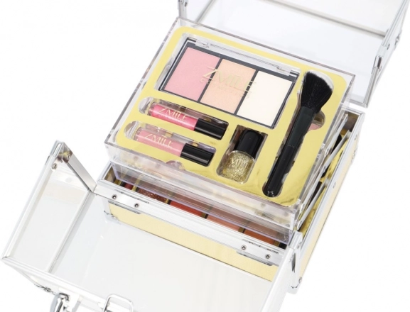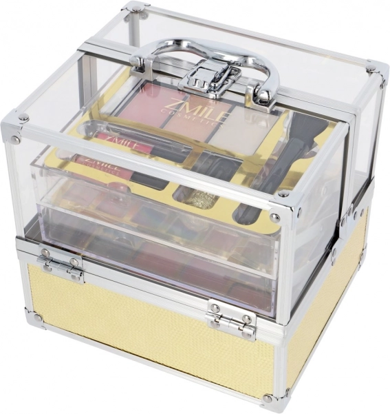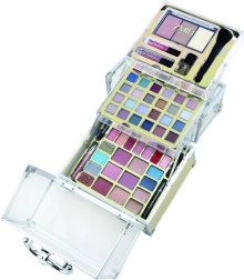 Elegante cosmetische koffer in luxueuze gouden uitvoering biedt alles wat je nodig hebt voor dagelijks make-up én speciale gelegenheden. Bevat in totaal 64 stuks accessoires, een brede reeks oogschaduws, lipsticks en make-upkwasten. De compacte acryl uitvoering is duurzaam en overzichtelijk. Het product is dermatologisch getest en voldoet aan strenge EU-normen.
