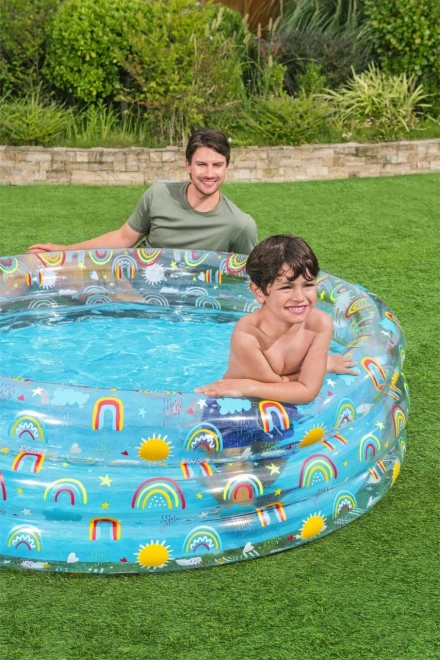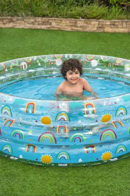Met regenboog- en zonmotieven is dit zwembad niet alleen praktisch, maar ook esthetisch aantrekkelijk en nodigt het kinderen uit om te spelen.