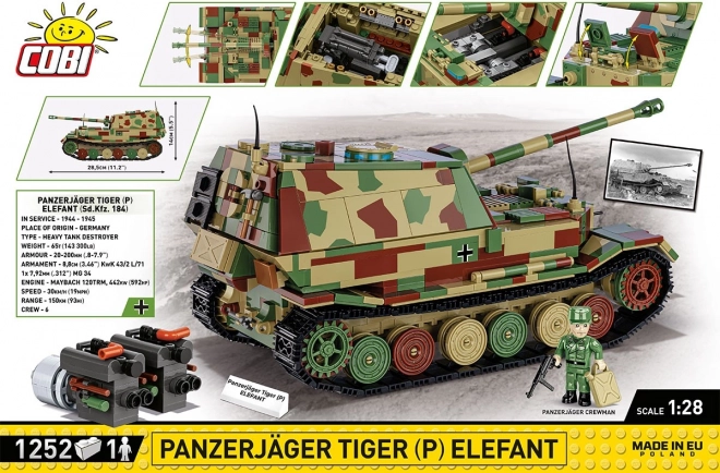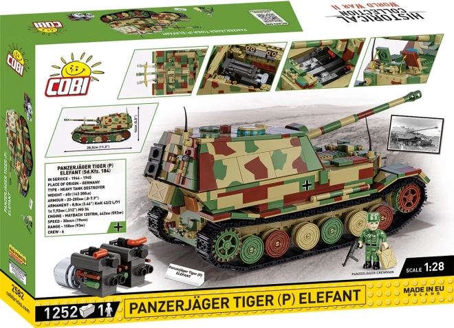 Bouw de iconische Duitse tankjager Panzerjäger Tiger (P) Elefant in indrukwekkende schaal 1:28 van 1252 onderdelen. Het model uit de Historical Collection biedt een gedetailleerde afwerking, functionerende rupsbanden, een draaibaar en verstelbaar kanon, een uitneembare motor, rijke prints zonder stickers en een minifiguur van de bemanning met accessoires.