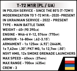 De COBI-bouwset reproduceert getrouw de gemoderniseerde tank T-72M1R die in Polen en Oekraïne wordt gebruikt. Op schaal 1:35 past hij perfect bij andere modellen uit de Armed Forces-serie. Dankzij een nieuw speciaal onderdeel voor de karakteristieke loopwielen, de draaibare koepel, het beweegbare kanon en de functionele rupsbanden is het bouwen, spelen en tentoonstellen een plezier.