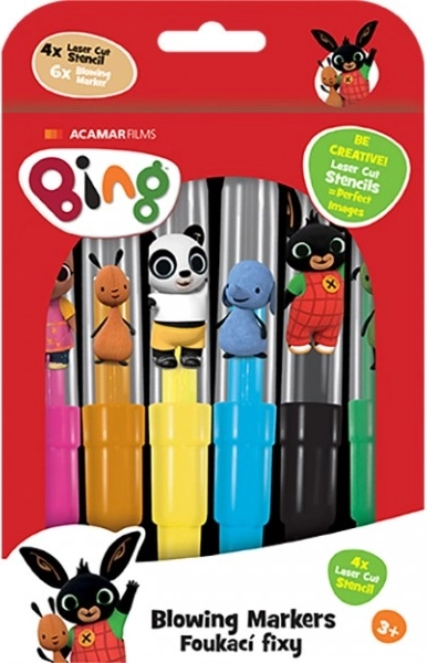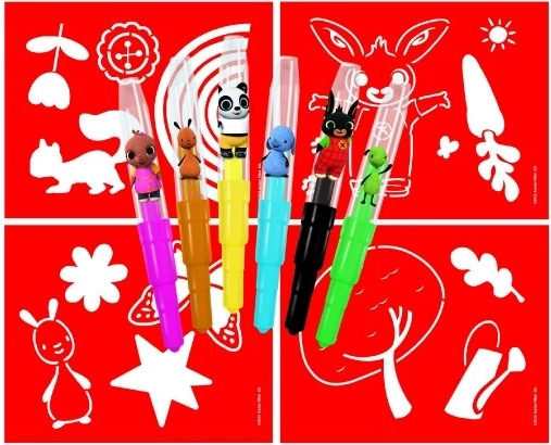 De BING-blaasstiftenset zal alle kleine kunstenaars verrukken. Zes vrolijke kleuren en thematische sjablonen maken het gemakkelijk om originele tekeningen met favoriete personages te creëren. Eenvoudig blazen door de stift zorgt voor zachte overgangen en spuiteffecten zonder rommel.