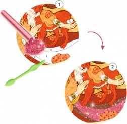 - De set bevat: 4 geïllustreerde kaarten (20 x 20 cm), 6 tubes met glitters, 1 kwast, 1 plastic hulpmiddel en een kleurrijk instructieboekje met stap-voor-stap instructies.