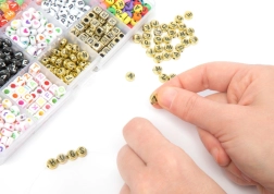 Set rijgkralen met ABC-lettertjes – de set bevat 15 soorten rijgkralen met letters. Verpakt in een praktische afsluitbare box.