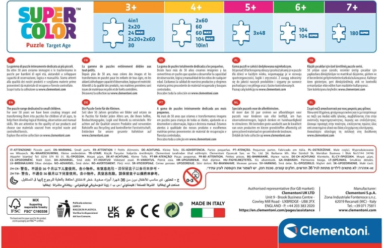 Ontdek de magie van het klassieke sprookje met de CLEMENTONI Disney Pinocchio puzzel uit de SuperColor-collectie. Kinderen trainen tijdens het leggen hun geduld, logica en fijne motoriek, begeleid door een kleurrijke DISNEY-illustratie. Hoogwaardige druk en stevig karton zorgen voor een lange levensduur en herhaald puzzelplezier.
