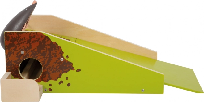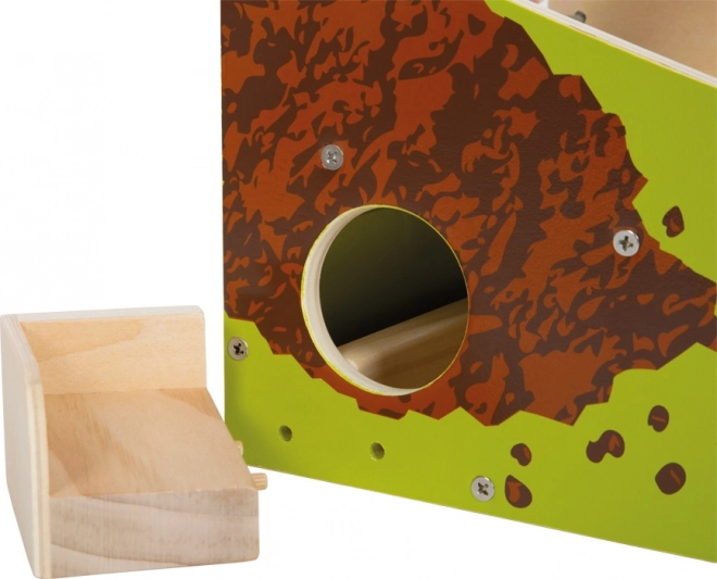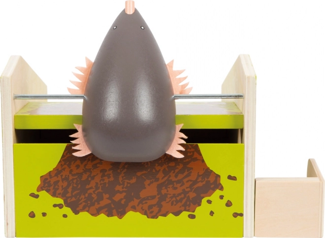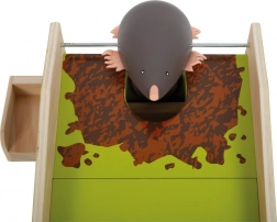 Een speciaal mechanisme tilt de mol op en laat hem “zwaaien” zodra het balletje door de tunnel rolt – directe feedback die kinderen motiveert om keer op keer te spelen.
