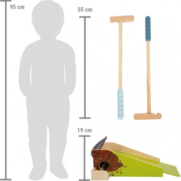 Ontdek de charme van minigolf in kinderformaat. De stabiele houten baan met een leuke “mollenbult” en grijpend mechanisme reageert op elke nauwkeurige putt – het balletje rolt door de tunnel en de mol steekt zijn kop omhoog. Dankzij de compacte afmetingen is het spel ideaal voor de kinderkamer, woonkamer en de tuin.