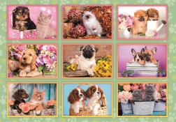 Een collage vol puppy’s (en kittens) met bloemen die dierenliefhebbers zal verrukken en na het leggen elke kinderkamer siert.