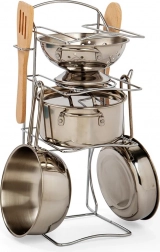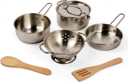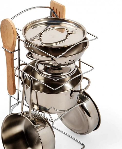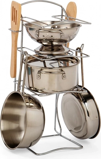 Met deze 8-delige set krijgen kinderen de kans en middelen voor doen alsof koken. Bevat realistisch ogende metalen keukengerei zoals een vergiet, pan, twee potten met deksel en ook een houten lepel met een spatel op een praktische standaard. Ideaal voor het stimuleren van creativiteit, taalontwikkeling en sociale vaardigheden.